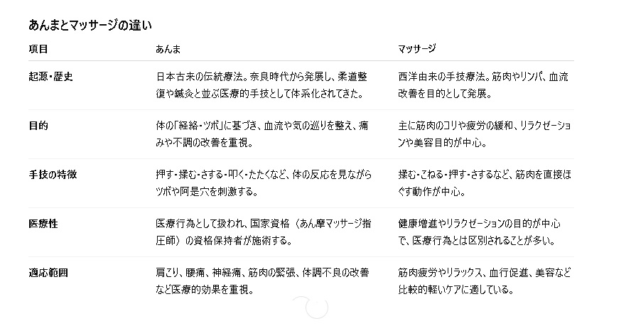 このように「あんま」と「マッサージ」では純然たる違いがある事がお分かりいただけたと思います。